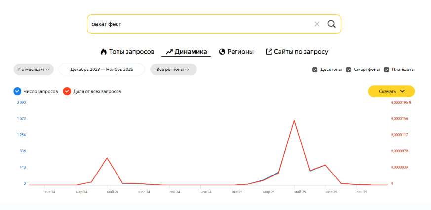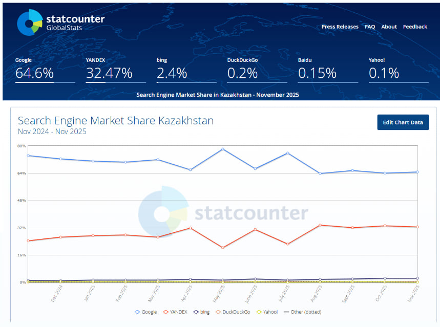 Для валидации данных мы использовали вторую систему оценки спроса — Вордстат, чтобы получить абсолютные значения поисковых запросов для сравнения год к году. На то, что эту систему можно использовать в Казахстане для сравнительного анализа, указывает сервис Статкаунтер: 32% аудитории в Казахстане используют Яндекс в качестве поискового сервиса.